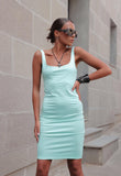 ქალის მუხლს ზემოთ, ტყავით გაწყობილი, მოკლე მკლავიანი საზაფხულო კაბა S/M