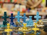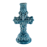 სასანთლე ცისფერი. ზომა: სიმაღლე - 9სმ, სიგანე - 5სმ. სანთლის ჩასადების დიამეტრი - 1სმ. მასალა: მოჭიქული კერამიკა.